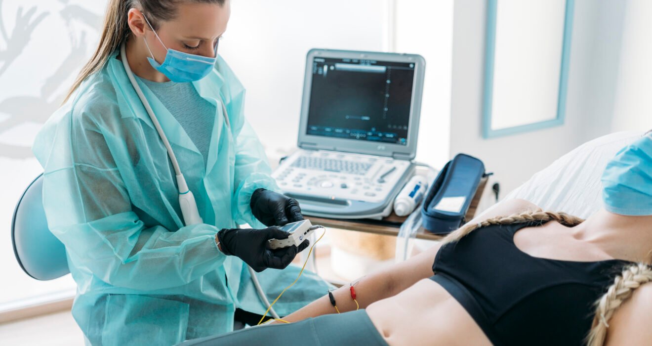 Cardiogram test. Elderly male patient receives heart rate monitored using electrocardiogram equipment with two doctors cardiologist